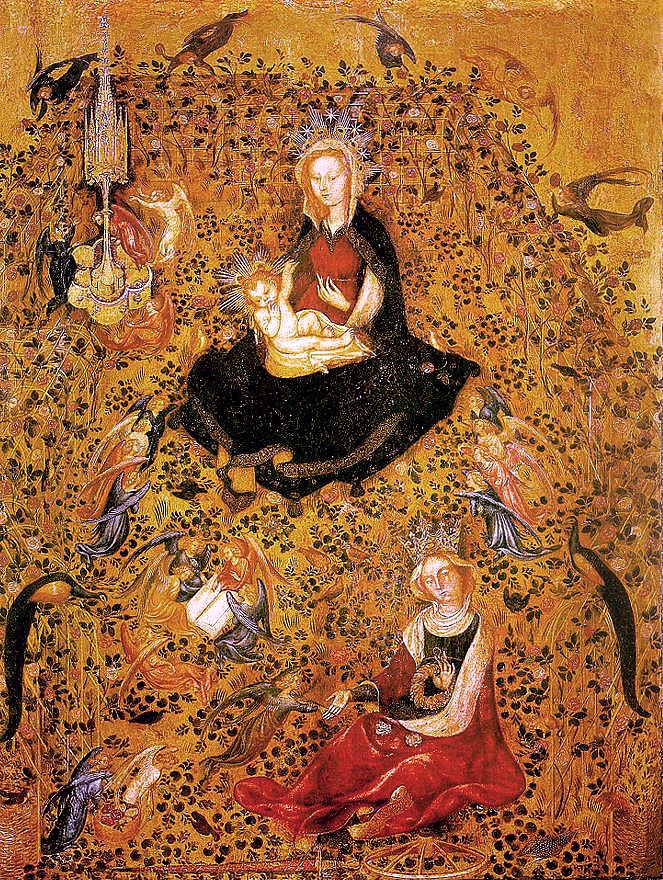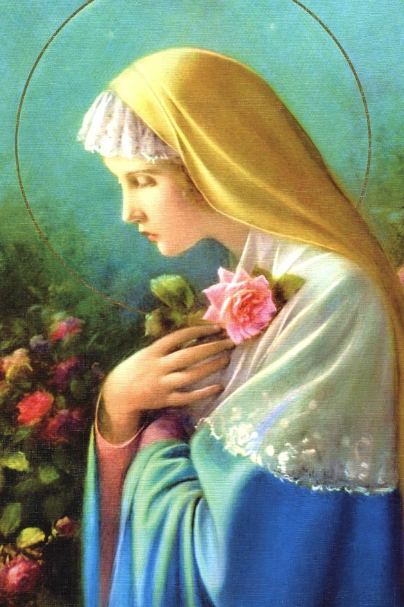 History shows, that the rose is the favourite flower of Our Lady herself, the Madonna of the Rose. In her apparition at Guadeloupe, she made use of roses as a sign of her presence and even arranged them, with her own beautiful hands, in the tilma of Juan Diego. At La Salette she wore a profusion of roses in three garlands and had tiny roses around the rim of her slippers. She brought beautiful roses with her at Lourdes, Pontmain, Pellevoisin, Beauraing and Banneaux. To Sister Josefa Menendez she showed her immaculate heart encircled with little white roses. Truly, she could be called the Madonna of the Rose. In the City of Damascus, very familiar to Mary, hundreds of men and women earn their living by working with roses, from which they distil rosewater and extract attar and syrup of rose. These people carry the scent of roses with them, wherever they go. This is a lesson for us – let us become so saturated with the virtues of Mary, the Madonna of the Rose, that we carry their fragrance and attract other souls to our Divine Lord, through His Mother, the Mystical Rose, the Madonna of the Rose. Among the many feasts of Our Lady we find mentioned in an old Latin chronicle: “30 January, Our Lady of the Rose, at Lucca in Italy. Three roses were found in January in the arms of the Statue of Our Lady there.” Cardinal Newman says “Mary is the most beautiful flower ever seen in the spiritual world. It is by the power of God’s grace that from this barren and desolate earth there ever sprung up at all flowers of holiness and glory and Mary is the Queen of them all. She is the Queen of spiritual flowers and, therefore, is called the Rose, for the rose is called, of all flower, the most beautiful. But, moreover, she is the Mystical or Hidden Rose, for mystical means hidden.” In the stately college of King’s Chapel, in Cambridge, England, one of the most renowned universities, built by Henry VIII in memory of his father, there can be discerned, hidden in one of the Tudor rose-bosses on the walls, a small head of Our Lady which somehow escaped observation, at the despoliation of images at the Protestant Deformation. Brother John, a clever carver, was hired to carve all of the roses; knowing of the King’s quarrel with the Pope, he secretly carved a tiny head of Mary, half-hidden within the rose petals in the upper tier of decorations, saying, “There you remain, Our Lady of the Rose, even if wicked men try to drive you and your Son from this Church.” His words came true, when the place was stripped of every trace of Faith, the diminutive head of the Mother of God still remained. But a rose has thorns and so had the Mystical Rose – the sharpest for herself alone; so she could have compassion on our infirmities. Never did the breathE of evil spoil the splendour of this Mystical Rose; never did God’s lovely flower, the Madonna of the Rose, cease to give forth the sweet perfume of love and praise. “Mystical Rose, thou hast been hailed to shed they fragrance sweet, to flood our desert with thy perfume rare. We beg thee, daily kneeling at thy feet, let fall thy petals for our repose, shower upon us thy aroma, O thou Mystical Rose.”