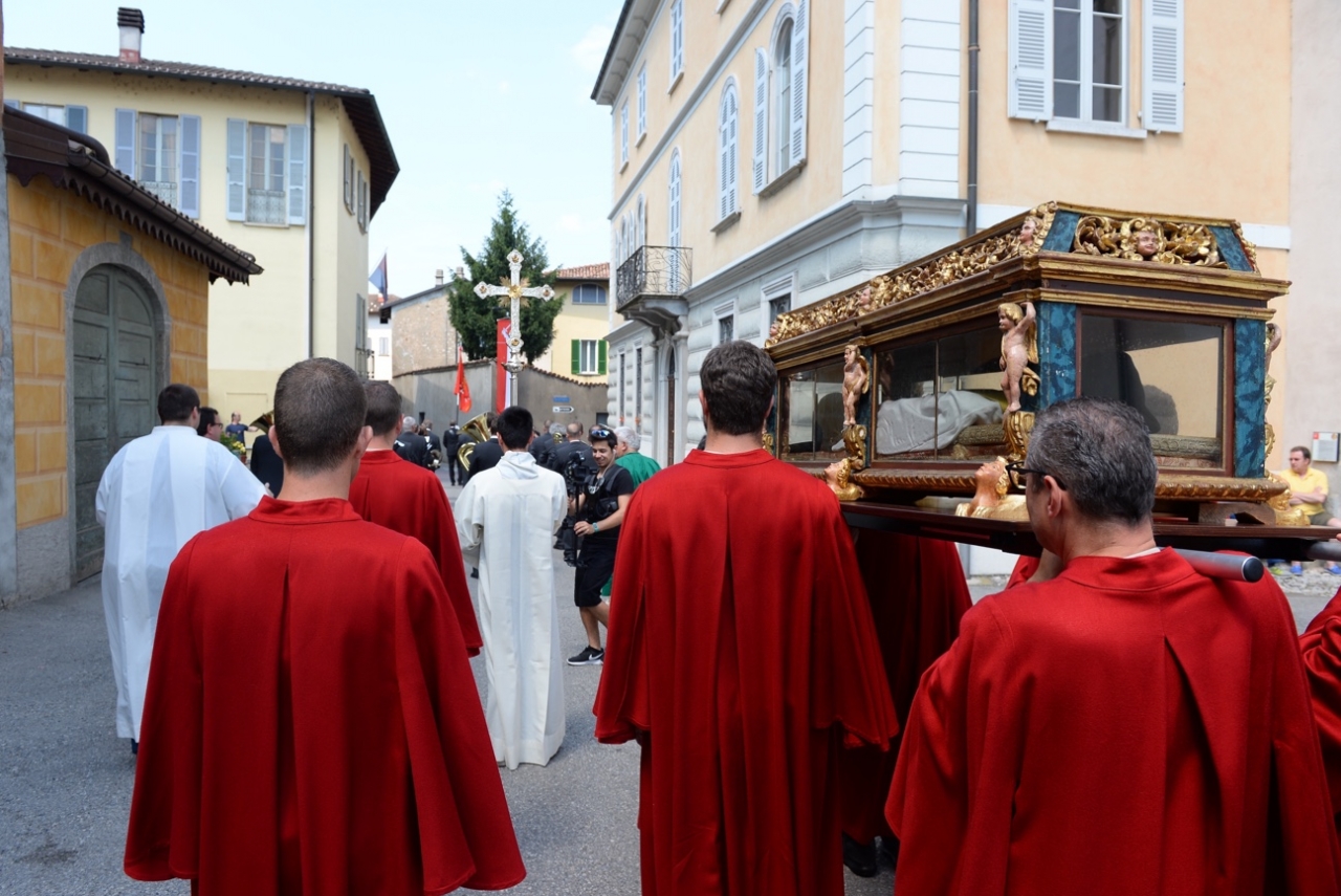 On the walls of the Baptistry, there are two beautiful paintings by Giovanni Battista Bagutti (1774-1823) of Rovio, depicting the passage of the blessed into mountain of solitude and his transport from San Giorgio to the Church of Riva. The liturgical feast is celebrated on 27 January, which in Riva, is considered a public holiday; while on the following Sunday, a procession and Holy Mass, is celebrated, with large numbers of pilgrims attending. The streets are decorated for devotion to the blessed, is still very much alive in the region.