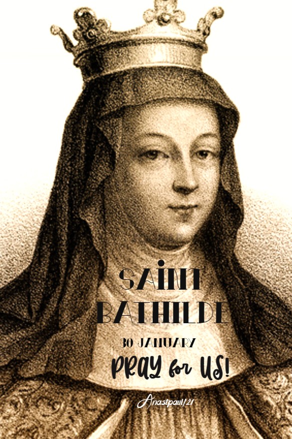 Saint of the Day – 30 January – Saint Bathilde (c 626–680) Queen, Regent, Widow and Mother, Religious, Apostle of the poor and of slaves, Social Reformer, pioneer in the abolition of Slavery, founder of Monasteries. Born in c 630 in England and died on 30 January 680 of natural causes. Other forms of her name are Bathilidis, Bathild, Batilda, Bathchilde and Bauteur.Patronage – children, the sick, all bodily illness, widows