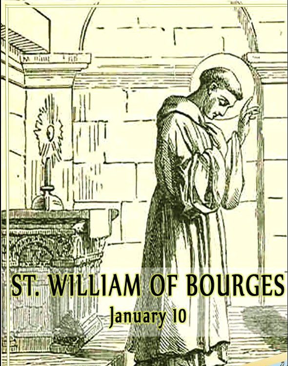Saint of the Day – 10 January – Saint William of Bourges O.Cist (c 1140-1209) Archbishop of Bourges from 1200 until his death, Confessor, Monk, renowned for miracles and virtue. He served as a Canon in Soissons and Paris before he entered the Order of Grandmont. Sometime later he entered the Cistercians. He was known to practice austerities, such as abstaining from meat and wearing a hair shirt. He was also known for his deep devotion to the Blessed Sacrament and for his conversion of sinners. He oversaw the construction of the new archdiocesan Cathedral that his predecessor had authorised and in which he himself would be buried. He performed eighteen miracles in life and many more in death. His Canonisation was celebrated under Pope Honorius III, a mere 9 years after his death, in 1218 and he was named as the Patron Saint for the Parisian college, i.e. the University of Paris as well as of gunsmiths. He was born as Guillaume de Donjeon in the 12th century in Nevers, France and died on 10 January 1209 at Bourges, France of natural causes whilst at prayer. He is also known as Guillaume de Bourges, William Berruyer, William de Don Jeon, William the Confessor. Additional Memorial – 8 November as one of the Saints of the Diocese of Evry.