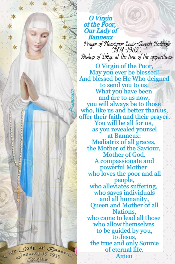 O Virgin of the Poor, May you ever be blessed! And blessed be He Who deigned to send you to us. What you have been and are to us now, you will always be to those who, like us and better than us, offer their faith and their prayer. You will be all for us, as you revealed yourself at Banneux: Mediatrix of all graces, the Mother of the Saviour, Mother of God. A compassionate and powerful Mother who loves the poor and all people, who alleviates suffering, who saves individuals and all humanity, Queen and Mother of all Nations, who came to lead all those who allow themselves to be guided by you, to Jesus, the true and only Source of eternal life. Amen