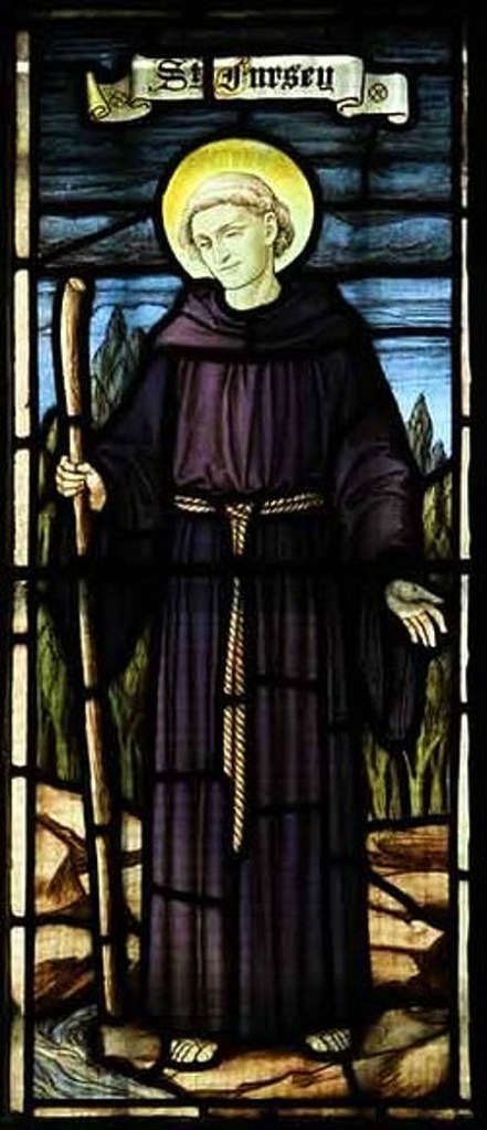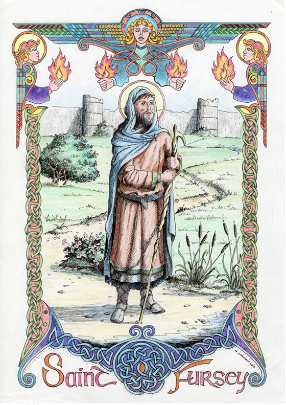 Fursey was born in Ireland in the closing years of the 6th century. as the son of an Irish Prince and was baptised by St Brendan the Traveller, his father’s uncle. He early showed desire and aptitude to study the Sacred Scriptures and his growth in the faith was matched only by a monastic discipline of life. In his early twenties he received visions that focussed his life on the urgency of preaching the Good News of Christ. His visions were also to play a pivotal role in the Church’s developing understanding of life after death and God’s continuing desire to show love and forgiveness. Fursey’s visions are among the first major accounts of a journey of a soul in the other world to be composed in the early medieval period.