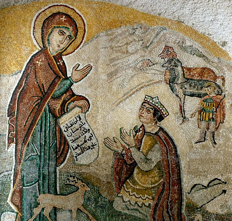 Mosaic depiction of Mary ordering Justinian not to kill her but to build a church on the rock in the background, after having first appeared to him as a gazelle. The scroll she holds reads: “No, thou shalt not kill me, Justinian but thou shalt build a Church for me, here, on this rock.”
