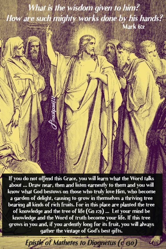 REFLECTION – “The Father sent the Word to appear to the world, who was dishonoured by His people, preached through Apostles and believed in by pagan nations. It is He who was from the beginning (Jn 1:1), who appeared new and proved to be old and is ever born young in the hearts of saints. He is the eternal, today counted a son (Ps 2:7). Through Him the Church is enriched and grace unfolding is multiplied in the saints, affording understanding, revealing secrets mysteries, making them understand the signs of the times, rejoicing over the faithful, given to those who seek for it, by whom pledges of faith are not broken and the boundaries set by the Fathers are not passed over. Then the fear of the law is praised in song and the grace announced by the prophets is learned and the faith of the gospels is established and what has been handed down from the Apostles is guarded and the Grace of the Church exults for joy. If you do not offend this Grace, you will learn what the Word talks about, through those through whom He wishes to talk, when He pleases … Draw near, then and listen earnestly to them and you will know what God bestows on those who truly love Him, who become a garden of delight, causing to grow in themselves a thriving tree bearing all kinds of rich fruits. For in this place are planted the tree of knowledge and the tree of life (Gn 2:9) … Let your mind be knowledge and the Word of truth become your life. If this tree grows in you and, if you ardently long for its fruit, you will always gather the vintage of God’s best gifts.” – A Letter to Diognetus (c 130) – 11, 3-7; 12, 1-2 and 7-8;