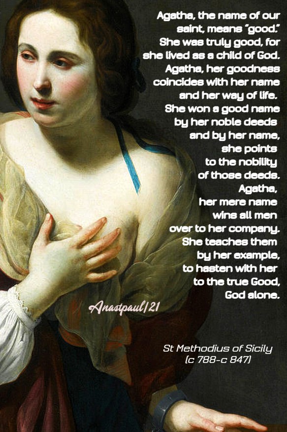 “My fellow Christians, our annual celebration of a Martyr’s feast, has brought us together. Agatha achieved renown in the early Church for her noble victory. … For her, Christ’s death was recent, His blood was still moist. Her robe is the mark of her faithful witness to Christ. Agatha, the name of our saint, means “good.” She was truly good, for she lived as a child of God. Agatha, her goodness coincides with her name and her way of life. She won a good name by her noble deeds and by her name, she points to the nobility of those deeds. Agatha, her mere name wins all men over to her company. She teaches them by her example, to hasten with her to the true Good, God alone.”