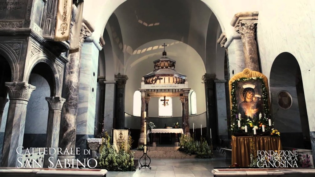 Sabinus was a friend of Saint Benedict, whom he visited at Montecassino and to whom, as recorded by St Gregory the Great, he once expressed his preoccupations on the incursions of the Ostrogoth King Totila into the Italian peninsula. According to the hagiographic legend, he succeeded in saving Canosa from the threat of the latter. In fact, the Dialogues of Pope Gregory I (Book III, Chapter 5) also contains a second anecdote relating to “Sabinus, Bishop of Canosa.” Totila, King of the Goths, who was sceptical about the prophetic powers of the blind St Sabinus, visited and had dinner with him. He handed him a glass of wine, in place of the cupbearer. “Then the man of God taking the cup but not seeing him that did deliver it, said: ‘Blessed be that hand.’ At which words, the King very merrily blushed because, albeit he was taken, yet he had found that gift in the man of God which before he desired to know.” Totila was so impressed that he renounced his pillaging.