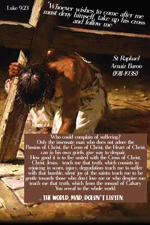 REFLECTION – “What joy to live in the Cross of Christ! Who could complain of suffering? Only the insensate man who does not adore the Passion of Christ, the Cross of Christ, the Heart of Christ, can in his own griefs, give way to despair… How good it is to live united with the Cross of Christ. Christ Jesus… teach me that truth, which consists in rejoicing in scorn, injury, degradation; teach me to suffer with that humble, silent joy of the saints; teach me to be gentle towards those who don’t love me or who despise me; teach me that truth, which from the mound of Calvary You reveal to the whole world. But I know: a very gentle voice within me explains it all; I feel something in me which comes from You and which I don’t know how to put into words; so much mystery is revealed that man cannot apprehend it. I, Lord, in my way, do understand it. It is love. In that is everything. I know it, Lord, nothing more is needed, nothing more, it is love! Who shall describe the love of Christ? Let men, creatures and all things, keep silent, so that we may hear in the stillness, the whisperings of love, meek, patient, immense, infinite, which from the Cross, Jesus offers us with His arms open. The world, mad, doesn’t listen.” – St Raphael Arnaiz Baron (1911-1938) a Spanish Trappist Monk – Spiritual writings 07/04/1938