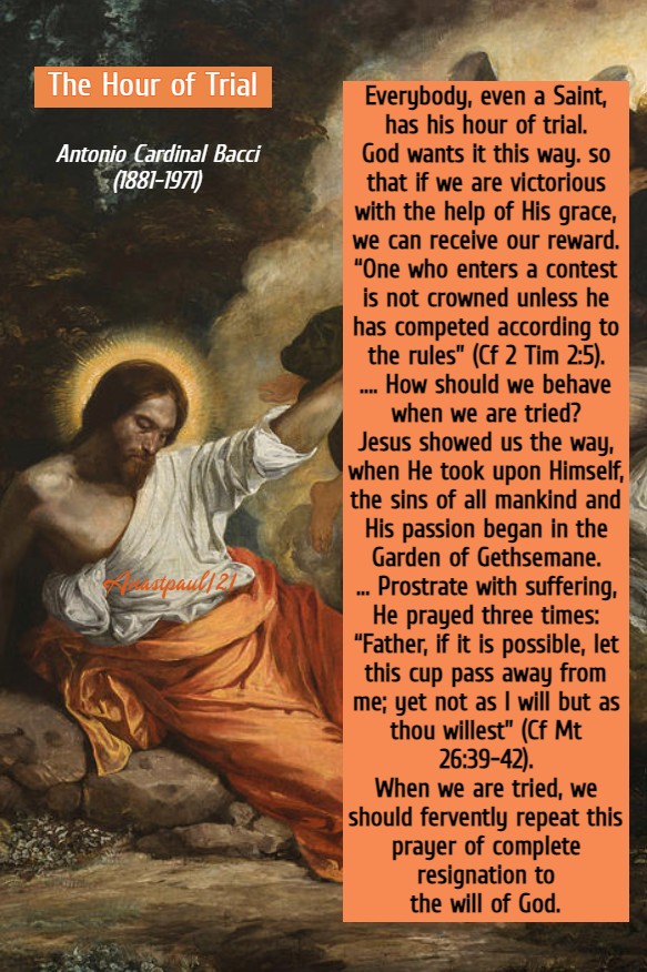 How should we behave when we are tried? Jesus showed us the way, when He took upon Himself, the sins of all mankind and His passion began in the Garden of Gethsemane. Even before He ascended Mount Calvary and was nailed to the Cross, He experienced here all the agony and terror of His redemptive mission. Prostrate with suffering, He prayed three times: “Father, if it is possible, let this cup pass away from me; yet not as I will but as thou willest” (Cf Mt 26:39-42). When we are tried, we should fervently repeat this prayer of complete resignation to the will of God.”