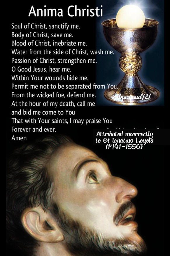 For many years the Anima Christi was popularly believed to have been composed by Saint Ignatius Loyola (1491-1556) , as he puts it at the beginning of his Spiritual Exercises and often refers to it. In the first edition of the Spiritual Exercises Ignatius merely mentions it, evidently supposing that the reader would know it. In later editions, it was printed in full. It was by assuming that everything in the book was written by Ignatius that it came to be looked upon as his composition. On this account the prayer is sometimes referred to as the Aspirations of St. Ignatius Loyola and so my image shows St Ignatius at prayer.