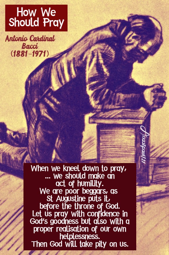 When we kneel down to pray, therefore, we should make an act of humility. We are poor beggars, as St Augustine puts it, before the throne of God. Let us pray with confidence in God’s goodness but also with a proper realisation of our own helplessness. Then God will take pity on us.