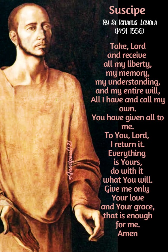 Take, Lord and receive all my liberty, my memory, my understanding, and my entire will, All I have and call my own. You have given all to me. To You, Lord, I return it. Everything is Yours, do with it what You will. Give me only Your love and Your grace, that is enough for me. Amen