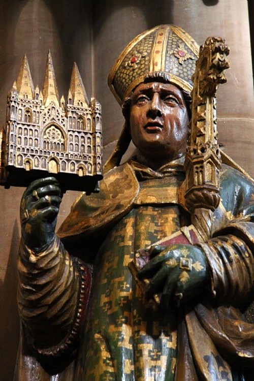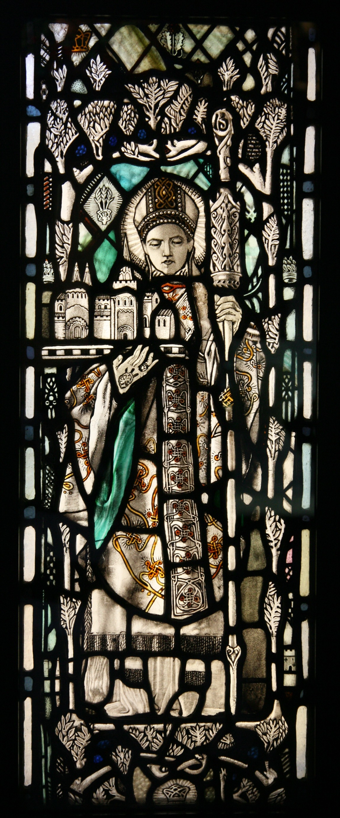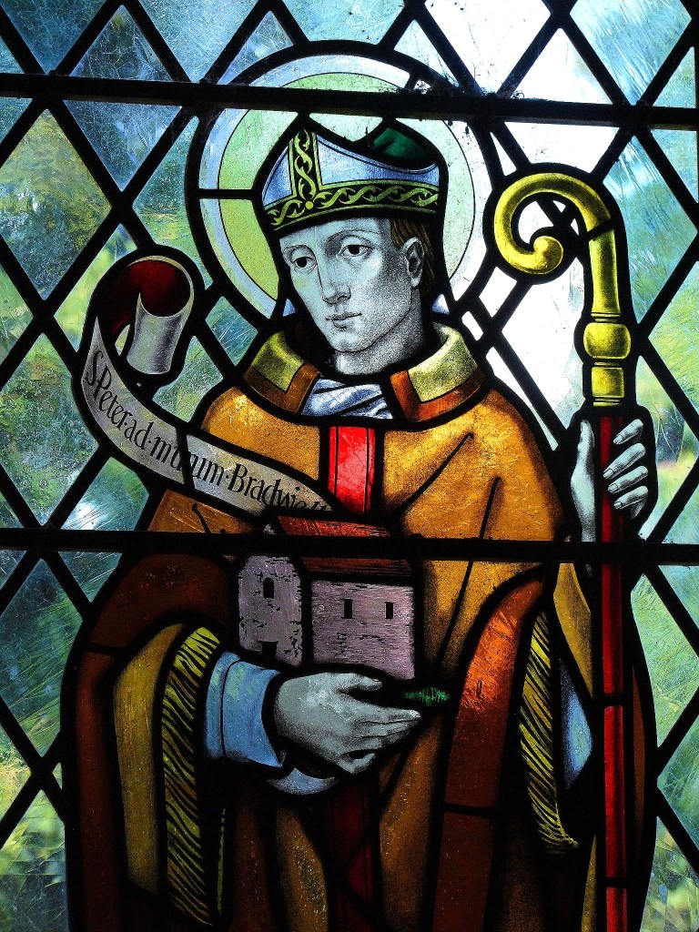 Chad’s emblem is a branch, perhaps this was suggested by the Gospel of St John which speaks of the fruitful branches of the vine. This was formerly read on the Feast of Chad’s Translation, which was celebrated with great pomp at Lichfield every year. However, he is most easily recognised in art through his cradling a little church with three spires, Lichfield Cathedral.