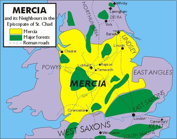 Chad’s new Diocese was not much less in extent than that of Northumbria. It comprised seventeen counties and stretched from the banks of the Severn to the shores of the North Sea. For the Dioceses of Worcester, Leicester, Lindsey and Hereford had still to be detached. Though such an area may be thought far beyond the power of one man to administer effectively, Chad apparently rose to the challenge. King Wulfhere gave him the land of fifty families upon which to build a Monastery, where the ancient Saxon Church still stands.