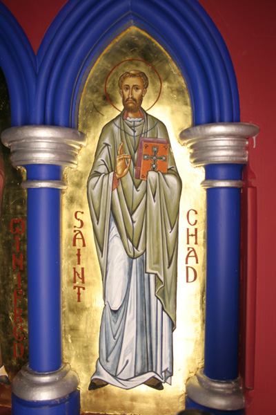 St Chad, or Ceadda, was the youngest of the four brothers – Cedd, Cynebil, Celin and Chad, all eminent Priests. Despite attempts to claim him as both a Scottish and an Irish saint, he was certainly an Angle, born of noble parents in Northumbria around 620. Bede tells us, that Chad, along with his elder brothers, was a pupil of St Aidan at his Lindisfarne school. The Bishop required the young men who studied with him, to spend much time in reading Holy Scripture and in learning, by heart, large portions of the Psalter, which they would require in their devotions. Upon the death of Aidan, in 651, the four young men went to Ireland to complete their training. The Emerald Isle was then full of men of learning and piety and Chad, there, made the acquaintance of Egbert, afterwards Abbot of Iona.