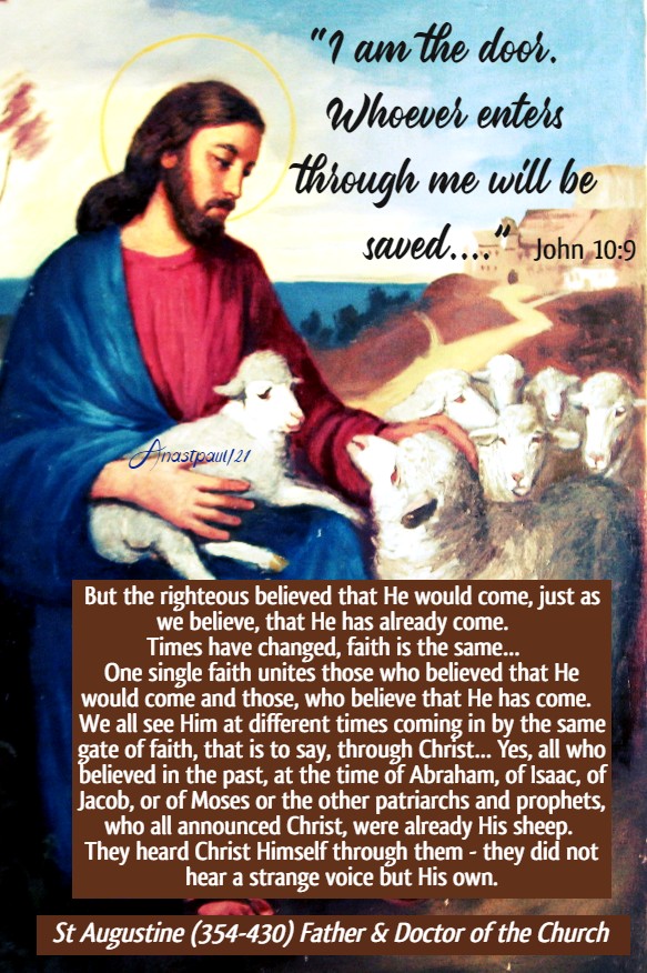 But the righteous believed that He would come, just as we believe, that He has already come. Times have changed, faith is the same… One single faith unites those who believed that He would come and those, who believe that He has come. We all see Him at different times coming in by the same gate of faith, that is to say, through Christ… Yes, all who believed in the past, at the time of Abraham, of Isaac, of Jacob, or of Moses or the other patriarchs and prophets, who all announced Christ, were already His sheep. They heard Christ Himself through them – they did not hear a strange voice but His own.” – St Augustine (354-430) Bishop of Hippo, Father & Doctor of Grace of the Church – 45th Treatise on the Gospel of Saint John