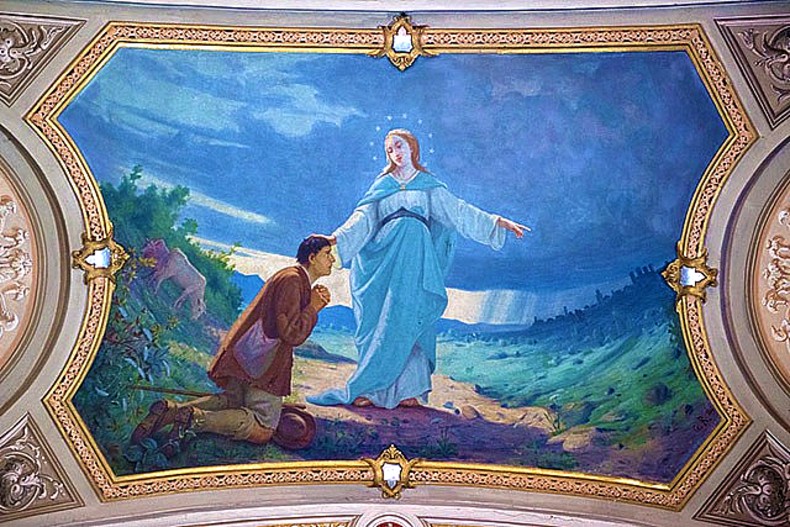 In the locality where the Sanctuary now stands, a poor deaf-mute of vulgar appearance and short stature, dressed in a rough habit, used to lead the animals to pasture. Nobody cared about him but on 8 May 1521 Bartholomew Coppa saw a Lady dressed in white coming to meet him, who approached him with maternal affection and blessed him with the word. He then told him to go to Fossano to announce the justice of God and to warn, that there would be great scourges without doing penance.