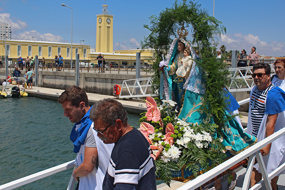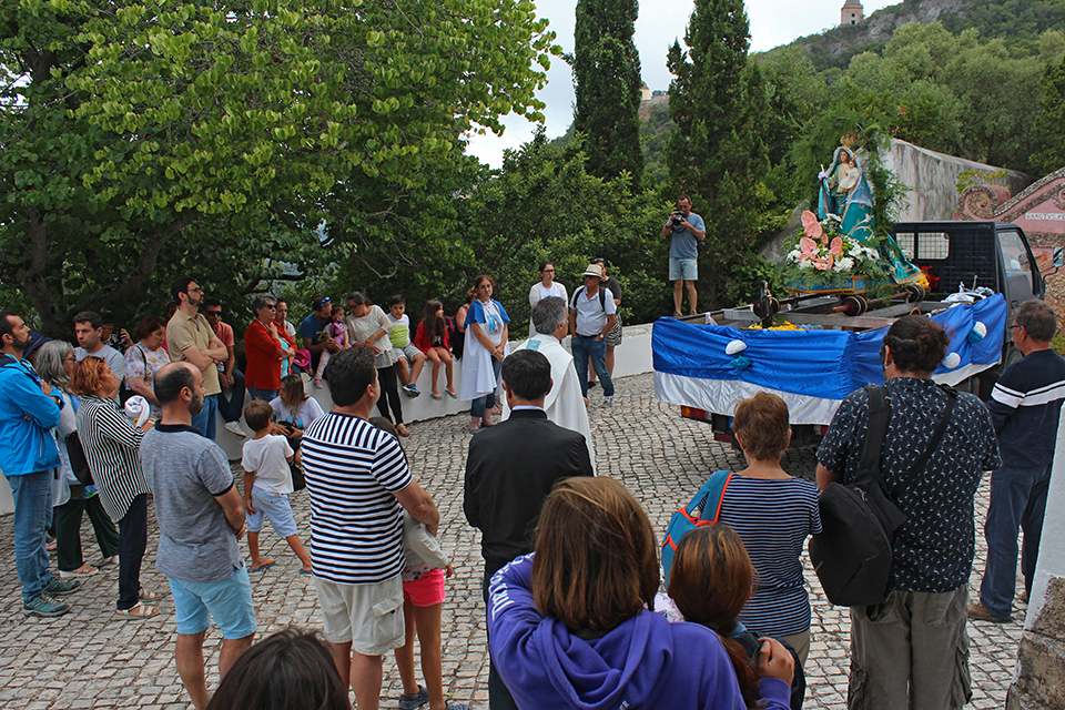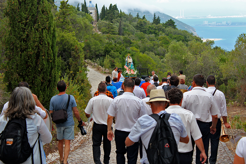 It is a replica that is taken in procession and like the original, has a natural head of hair and a silver crown, a blue mantle over an embroidered dress bedecked with silver sequins. In one hand the Blessed Virgin carries the Baby Jesus who wears a similar crown to that of His Mother. In the other hand, Our Lady holds a silver scepter. Only half a meter tall, she has a profound physical and spiritual presence. The procession winds through several City streets, accompanied by a band, banners, and flags. A great crowd processes each year to pay homage to Senhora da Arrábida, or in thanksgiving for answered prayers and many climb the mountain barefoot.