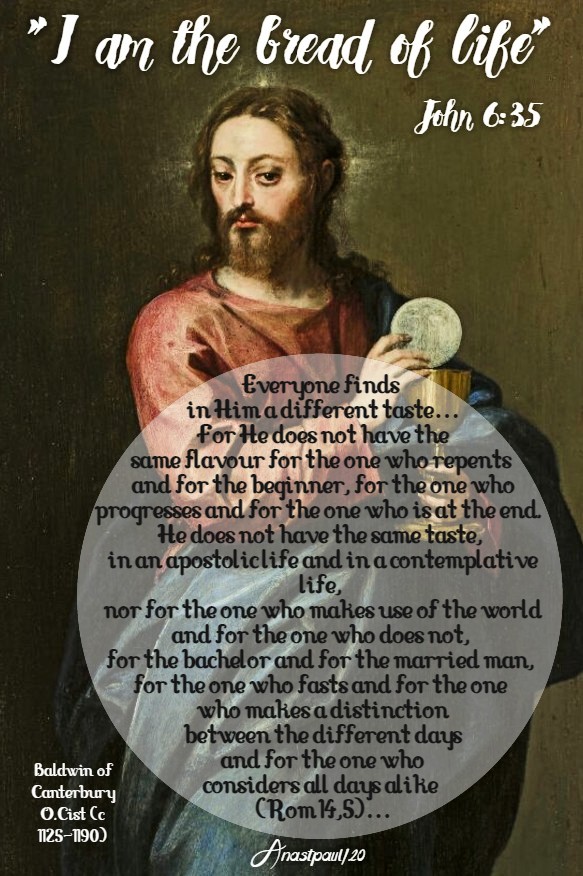 This bread has a sweet taste because it delivers one from all worries, it heals sicknesses, it eases trials, it assists one’s efforts and strengthens one’s hopes…Those who have tasted it hunger for it, those who hunger, will be satisfied.” – Baldwin of Canterbury O.Cist (c 1125-1190) Cistercian Abbot, then Bishop – The Sacrament of the Altar III, 2