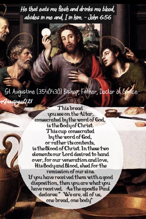 REFLECTION – “This bread you see on the Altar, consecrated by the word of God, is the Body of Christ. This cup consecrated by the word of God, or rather its contents, is the Blood of Christ. In these two elements our Lord desired to hand over, for our veneration and love, His Body and Blood, shed for the remission of our sins. If you have received them with a good disposition, then you are what you have received. As the apostle Paul declares: “We are, all of us, one bread, one body” (1 Cor 10,17)…