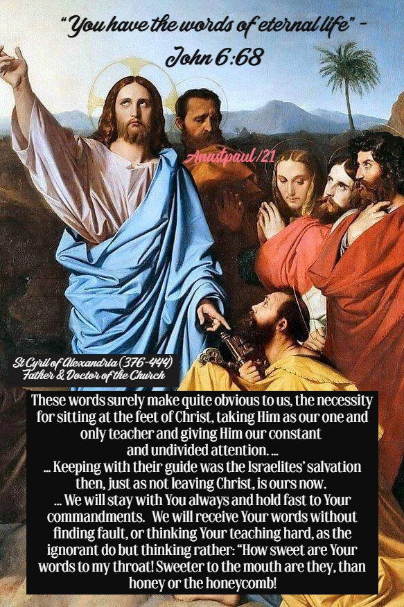 “Whoever serves me must follow me, so as to be with me wherever I am” (Jn 12:26) … But accompanying the Saviour Christ and following Him, is by no means to be thought of as something done by the body. It is accomplished rather, by deeds springing from virtue. Upon such virtue the wisest disciples firmly fixed their minds…. With good reason they cried out, “Where can we go?” It was as though they said: We will stay with You always and hold fast to Your commandments. We will receive Your words without finding fault, or thinking Your teaching hard, as the ignorant do but thinking rather: “How sweet are Your words to my throat! Sweeter to the mouth are they, than honey or the honeycomb!” (Ps 118[119]:103).” … St Cyril of Alexandria (376-444) – Father and Doctor of the Church – Commentary on Saint John’s Gospel, 4, 4