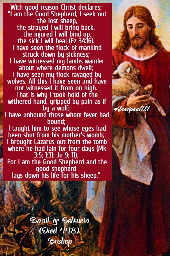 The prophet knew this shepherd when, long before His Passion, He declared what would take place: “Like a sheep led to the slaughter or a sheep, dumb before the shearers, he opened not his mouth” (Is 53:7). Like a sheep, the shepherd has offered His neck for His flock …. By His death, He heals from death; by His tomb, He empties the tomb …. The tombs are full and the prison shut until the shepherd, comes down from the cross, He has come to bring His captive sheep the joyful news of their liberation. We see Him in hell where He gives the order for their release (1 Pt 3:19); we see Him call His sheep once more, giving them the call to life from the dwellings of the dead. “The good shepherd lays down his life for his sheep.” This is how He intends to win the affection of His sheep and those who know how to listen to His voice, love Christ.” – Basil of Seleucia (Died 448) Bishop of Seleucia, Writer – Oratio 26
