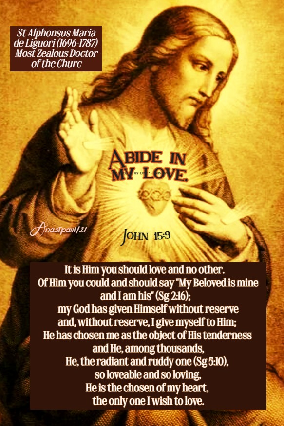 Therefore, it is Him you should love and no other. Of Him you could and should say “My Beloved is mine and I am his” (Sg 2:16); my God has given Himself without reserve and, without reserve, I give myself to Him; He has chosen me as the object of His tenderness and He, among thousands, He, the radiant and ruddy one (Sg 5:10), so loveable and so loving, He is the chosen of my heart, the only one I wish to love.”- St Alphonsus Maria de Liguori (1696-1787) Bishop and Most Zealous Doctor of the Church – The manner of conversing with God, trans. from the Italian
