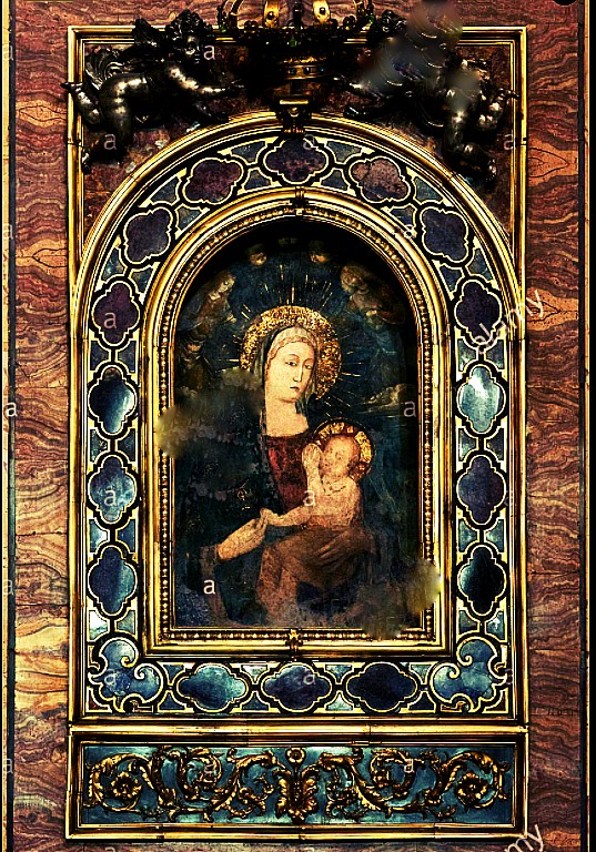 The venerated painting of Our Lady of Miracles depicts the Blessed Virgin holding the Divine Child. It currently hangs over the high Altar at the Church, which was specifically designed by Carlo Maderno to display and enshrine the famous painting.