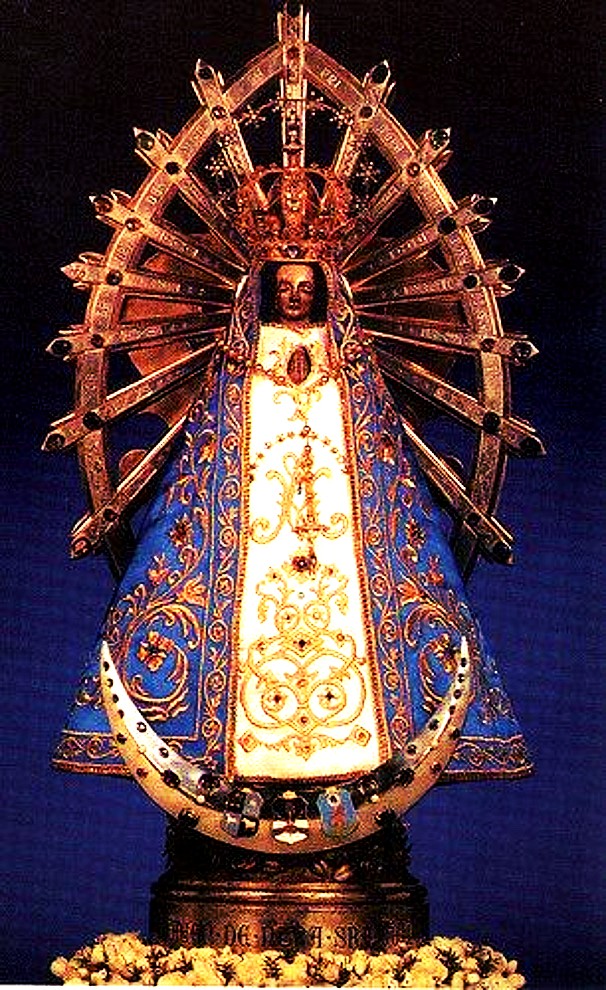 The Virgin is a two feet tall terracotta Statue of Our Lady. It was made in Brazil and sent to Argentina in May 1630. Its original appearance seemed inspired by Murillo’s Immaculates. In 1887, to preserve and protect it, the image was given a solid silver covering. It is usually clothed with a white robe and sky blue cloak, the colours of the Argentinian flag. Only the dark oval face with big blue eyes and the hands folded in prayer are now visible. Tradition tells us that a settler ordered the image of Mary Immaculate in 1630 because he intended to create a Shrine in her honour to help reinvigorate the Catholic faith in Santiago del Estero, his region. After embarking from the Port of Buenos Aires, the caravan carrying the image stopped at the residence of Don Rosendo Oramas, located in the present town of Zelaya. When the caravan wanted to resume the journey, the oxen refused to move. Once the crate containing the image were removed, the animals started to move again. Given the evidence of a miracle, people believed the Virgin wished to remain there. The image was venerated in a primitive Chapel for 40 years. Then the image was acquired by Ana de Matos and carried to Luján, where it currently resides. A Basilica was built in its honour, where the image now resides above the high Altar.