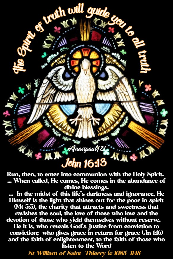Just as those who worship God must necessarily worship Him “in spirit and truth” (Jn 4:24), so those who would know Him, have only to seek an understanding of the faith in the Holy Spirit. … In the midst of this life’s darkness and ignorance, He Himself is the light that shines out for the poor in spirit (Mt 5:3), the charity that attracts and sweetness, that ravishes the soul, the love of those who love and the devotion of those who yield themselves without reserve. He it is, who reveals God’s justice from conviction to conviction; who gives grace in return for grace (Jn 1:16) and the faith of enlightenment, to the faith of those who listen to the Word.” … St William of Saint-Thierry (c 1085-1148) – The Mirror of Faith, 6