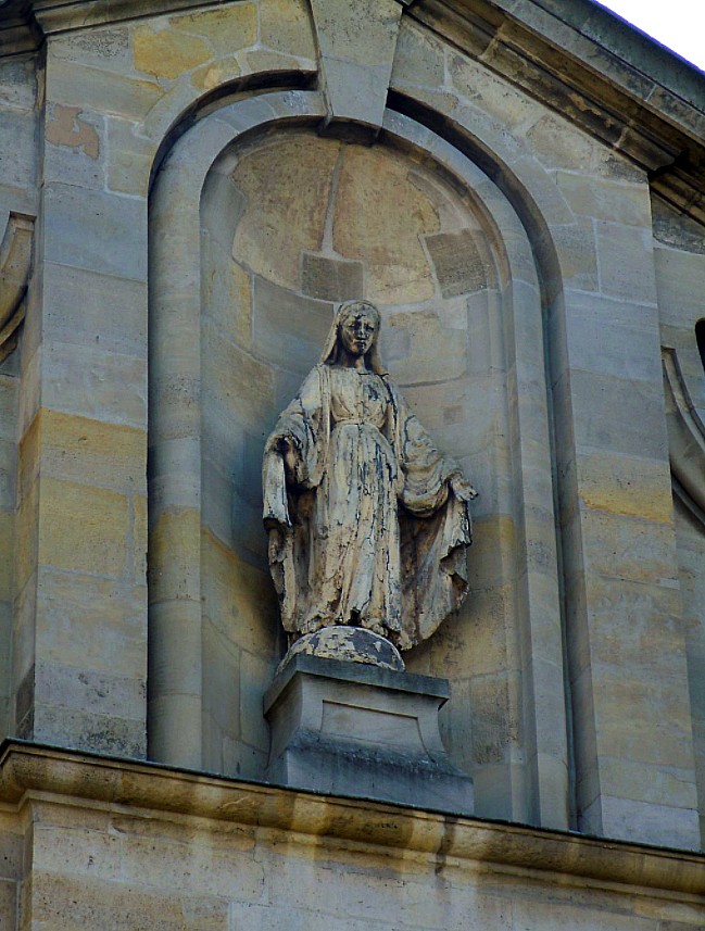 During the French revolution, in 1789, the Statue of the miraculous Virgin was profaned. It was dragged on the road leading to Saint Denis with a rope around its neck; the Sans-Culottes movement burned it singing the French song “Carmagnole et Ah! Ca ira!” proof of the Satanic roots of the French Revolution. One of her hands was saved from the flames and was preserved. The present Statue of the Virgin, located in the left Chapel, was sculpted in wood by Baffet House in 1873. It is a copy of an ancient Statue found that year in the Chapel Saint-Julien-Le-Pauvre at Hotel-Dieu. It was inserted into a Neo Gothic frame, flanked by two angels holding phylacteries, (a coiled-end speech scroll bearing legends) which recall the miracle in 1582 when the Virgin restored a stillborn child to life.