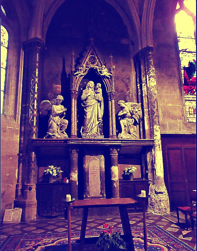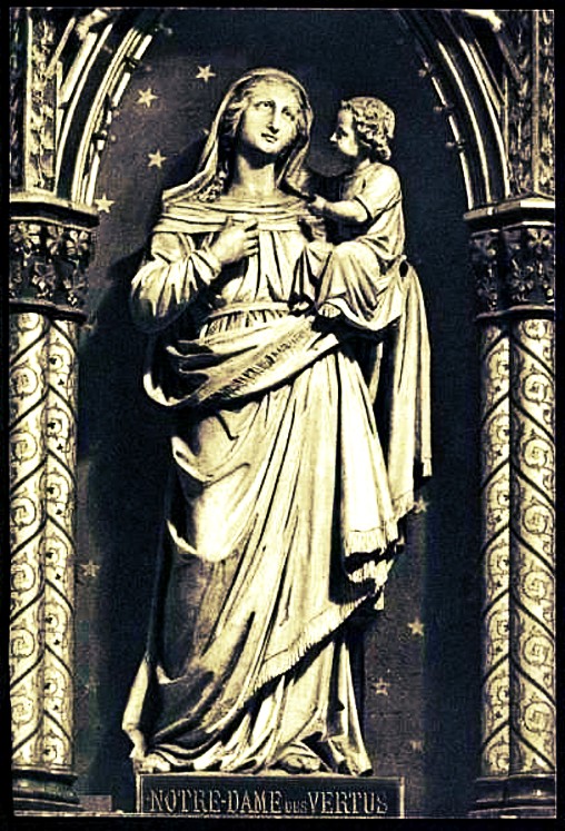 The small Sanctuary was later replaced by a more imposing Church whose construction began in the fifteenth century. Particularly remarkable are the stained glass windows that adorn the Church and remind the visitor of the extraordinary history of this place, for they relate to the many different miracles performed by the Blessed Virgin in the Chapel, of which there were many. Virtually every great Saint is depicted in these windows too – if you wish to see them, although they are not professional photographs, go here: https://www.tripadvisor.com/Attraction_Review-g3347617-d10980848-Reviews-Eglise_Notre_Dame_des_Vertus- There are numerous Statues and Altars of the Blessed Virgin in the Sanctuary, all of them highly venerated by pilgrims.