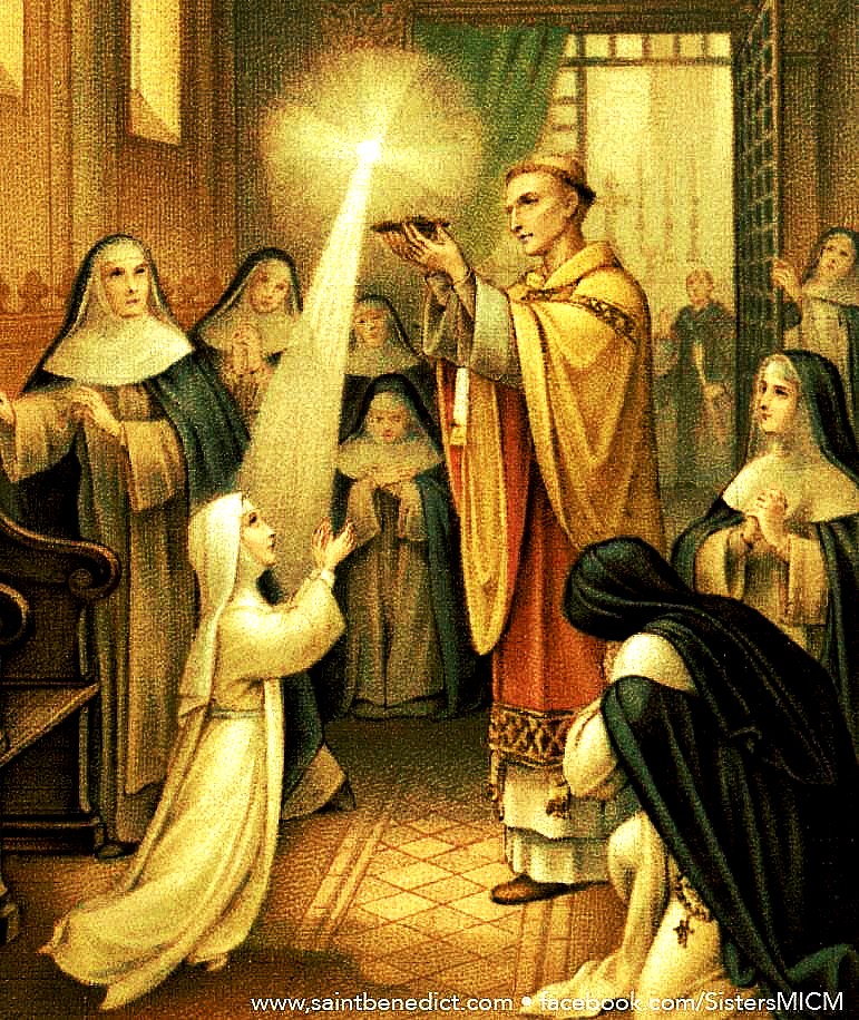 As spring approached, the sisters, who perhaps thought that they had succeeded in diverting Imelda’s “childish fancy” to go to Communion with the grown-ups, were a bit startled when she asked again, shortly before the Feast of the Ascension, to receive her First Holy Communion. (“Asked,” in fact, is not the word. She begged them insistently, it seems.) When the Chaplain was consulted, he agreed with the Sisters and responded with no hesitation that Imelda was much too young. On the Vigil of the Ascension Imelda was in her place in the Chapel, quietly praying as the Sisters received Communion. Then Jesus did a little “insisting” of His own. After Mass, as one of the nuns was clearing the Altar, she heard a noise and looked up to the choir to see Imelda, a glowing light shining above her head, with the Sacred Host suspended in the light.