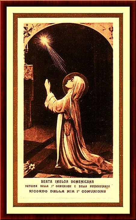 Imelda Lambertini was born of a noble family in Bologna, Italy in 1322. Her parents raised her to love her Catholic faith and through their influence she developed a love for prayer, especially for the Mass. Often she would attend Mass and Compline (Night Prayer of the Divine Office) at a nearby Dominican Church. Her mother also taught Imelda to cook and sew for the poor and cultivated in her child an eagerness to perform the corporal works of mercy. Even so, her mother and father, both of whom were getting on in years, were surprised when Imelda asked permission at the tender age of nine to go to live with the Dominican nuns at a neighbouring Monastery. As difficult a decision as this was, her parents evidently sensed the depth of their child’s desire and entrusted her spiritual formation to the Dominicans at Val di Pietra.