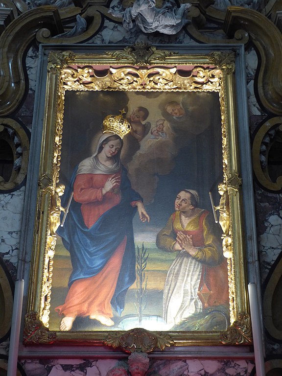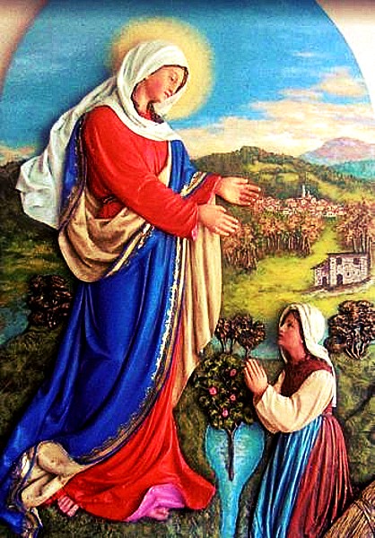 Domenica Targa of Guardia, thirty years old, was busy supervising the cattle grazing,which suddenly, with no apparent visible reason, started running in all directions as if she were crazy. The shepherdess then began to cry out: “Mary, Jesus, help me.” As soon as she uttered these words, the Virgin Mary appeared before her with a white veil on her head and thus addressed her: “You called Jesus and Mary for help and they will help you … Do you promised once again to visit Our Lady of Caravaggio? But do not go to Caravaggio! Go rather to the Feast of the Ascension of Christ in the Chapel of St Anne in Montagnaga. There you will find a portrait of the Blessed Virgin by Caravaggio. Kneel down and address your prayers with a sincere heart to Jesus and Mary, then you will see miraculous things. “