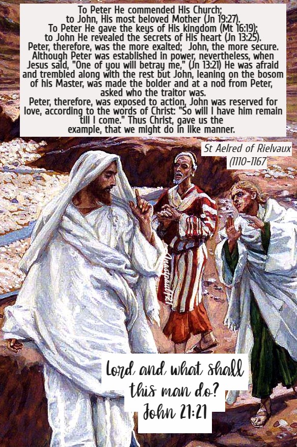 To Peter He commended His Church; to John, His most beloved Mother (Jn 19:27). To Peter He gave the keys of His kingdom (Mt 16:19); to John He revealed the secrets of His heart (Jn 13:25). Peter, therefore, was the more exalted; John, the more secure. Although Peter was established in power, nevertheless, when Jesus said, “One of you will betray me,” (Jn 13:21) He was afraid and trembled along with the rest but John, leaning on the bosom of his Master, was made the bolder and at a nod from Peter, asked who the traitor was. Peter, therefore, was exposed to action, John was reserved for love, according to the words of Christ: “So will I have him remain till I come.” Thus Christ, gave us the example, that we might do in like manner. – St Aelred of Rielvaux (1110-1167) Cistercian Monk – Spiritual Friendship, III, 115, 117