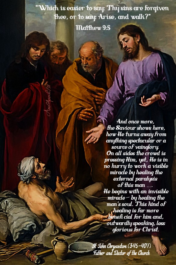 And once more, the Saviour shows here, how He turns away from anything spectacular or a source of vainglory. On all sides the crowd is pressing Him, yet, He is in no hurry to work a visible miracle by healing the external paralysis of this man …. He begins with an invisible miracle – by healing the man’s soul. This kind of healing is far more beneficial for him and, outwardly speaking, less glorious for Christ.” – St John Chrysostom (345-407) Priest at Antioch then Bishop of Constantinople, Father and Doctor of the Church – homilies on Saint Matthew’s Gospel, no. 29, 1.