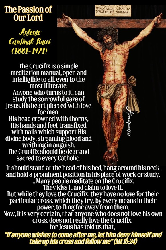 “The Crucifix is a simple meditation manual, open and intelligible to all, even to the most illiterate. Anyone who turns to it, can study the sorrowful gaze of Jesus, His heart pierced with love for men. His head crowned with thorns, His hands and feet transfixed with nails which support His divine body, streaming blood and writhing in anguish. The Crucifix should be dear and sacred to every Catholic. It should stand at the head of his bed, hang around his neck and hold a prominent position in his place of work or study.