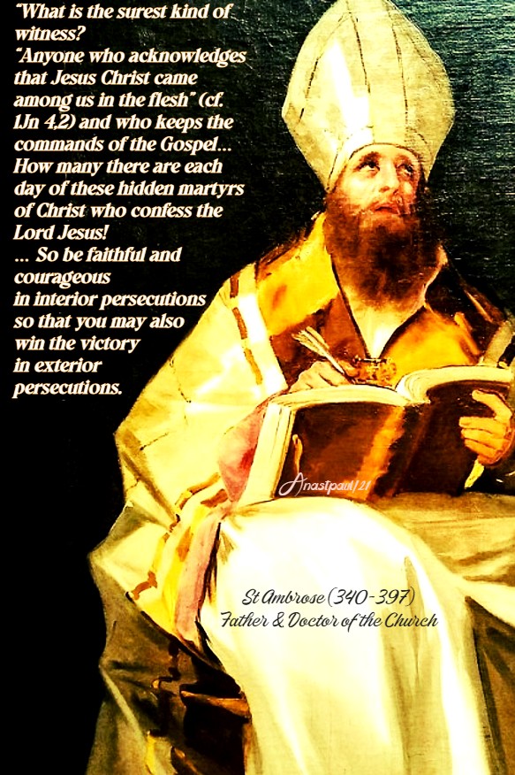 “What is the surest kind of witness? “Anyone who acknowledges that Jesus Christ came among us in the flesh” (cf. 1Jn 4,2) and who keeps the commands of the Gospel… How many there are each day of these hidden martyrs of Christ who confess the Lord Jesus! … So be faithful and courageous in interior persecutions so that you may also win the victory in exterior persecutions.”