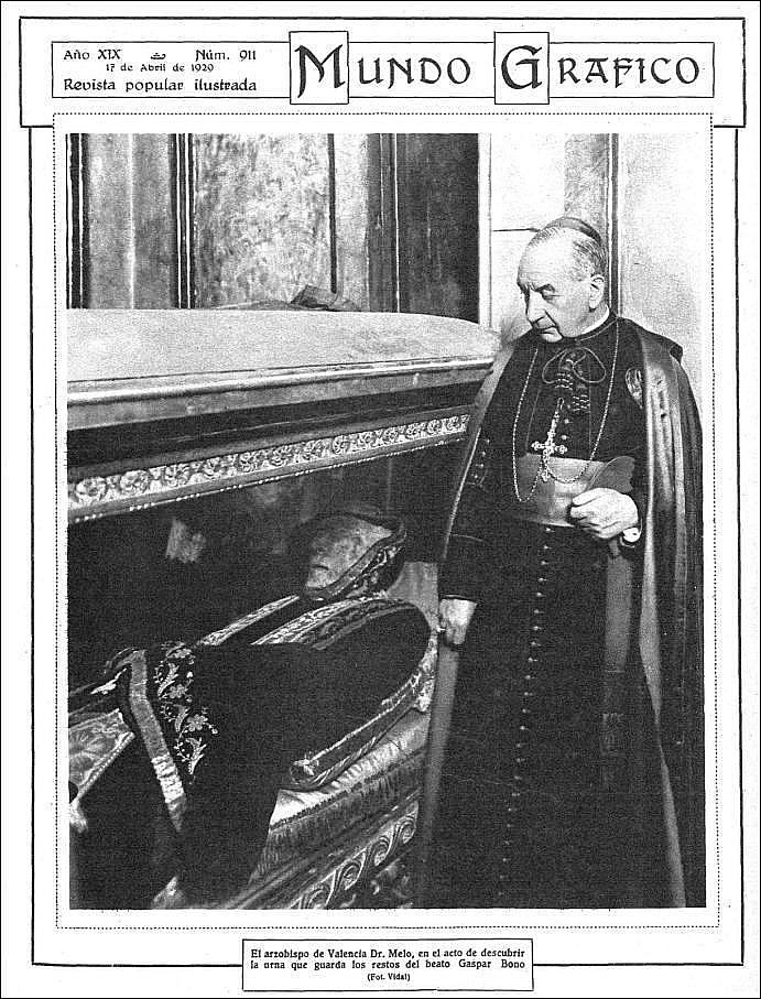 He died on 14 July 1604, the body being exposed in the conventual Church of St Sebastián de Valencia, miracles and wonders attributed to his intercession took place immediately. He was buried three days later under the steps of the main Altar. In 1835, after the suppression of the Monastery under the Napoleonic rule of Spain, the urn containing his bones was moved to the Church of St Nicolás, where he had been Baptised as a baby and enshrined under the Altar of the Chapel of St Raphael. Gaspar’s remains were damaged in 1823 and desecrated in 1936, so that only some bones are today venerated in the Parish of St Nicolás de Valencia.