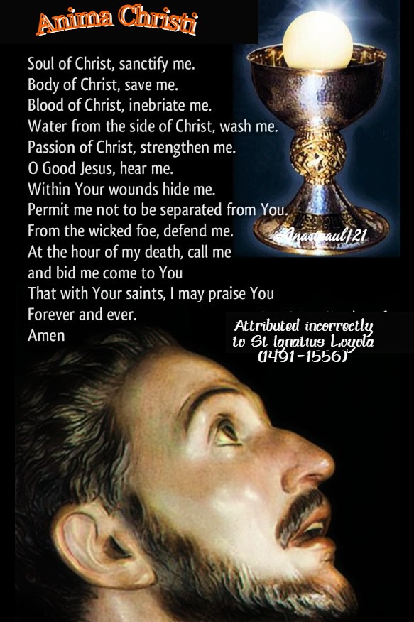 For many years the Anima Christi was popularly believed to have been composed by Saint Ignatius Loyola (1491-1556) , as he puts it at the beginning of his Spiritual Exercises and often refers to it. In the first edition of the Spiritual Exercises Ignatius merely mentions it, evidently supposing that the reader would know it. In later editions, it was printed in full. It was by assuming that everything in the book was written by Ignatius that it came to be looked upon as his composition. On this account the prayer is sometimes referred to as the Aspirations of St. Ignatius Loyola and so my image shows St Ignatius at prayer.