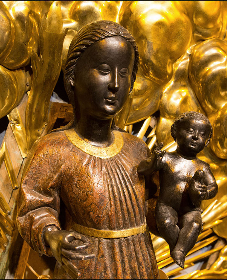 Although tradition holds the present Statue to be the original, it is unlike any that remain from the Ottonian period. Carved of dark wood, the graceful, sweet-faced Madonna, her right knee slightly bent, stands a little over three feet tall, holding the Divine Child in her left arm. This is a typical late Gothic work of the mid-1400s, possibly installed after the third fire in 1465. Displayed before a great aureole of golden rays,the Statue has worn elaborate vestments in colours matching those of Priests for each liturgical season. The Feast of Our Lady of Einsiedeln is 16 July but is usually celebrated on the Sunday following. Even greater pilgrimages occur on 14 September in honour of the Church’s miraculous Consecration.