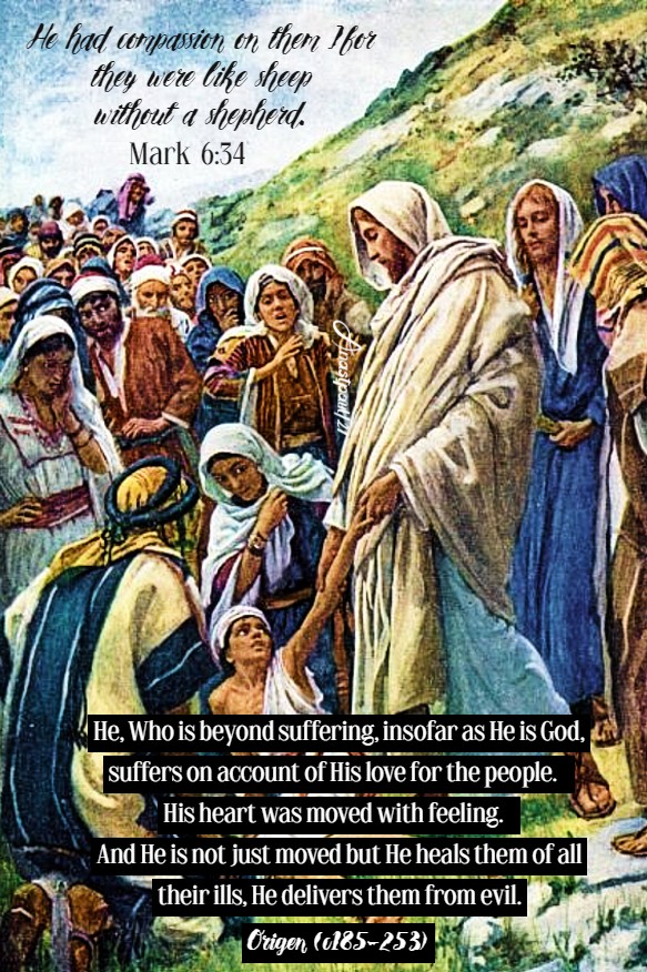 This crowd of those outside, that He went to meet, is very great. Shedding the light of His Presence upon it, He looked round at it and, seeing what sort of people were surrounding Him, he found them even more worthy of compassion. He, Who is beyond suffering, insofar as He is God, suffers on account of His love for the people. His heart was moved with feeling. And He is not just moved but He heals them of all their ills, He delivers them from evil.” – Origen (c185-253), Priest, Theologian, Exegist, Writer, Apologist, Father – Commentary on St. Matthew, 10,23