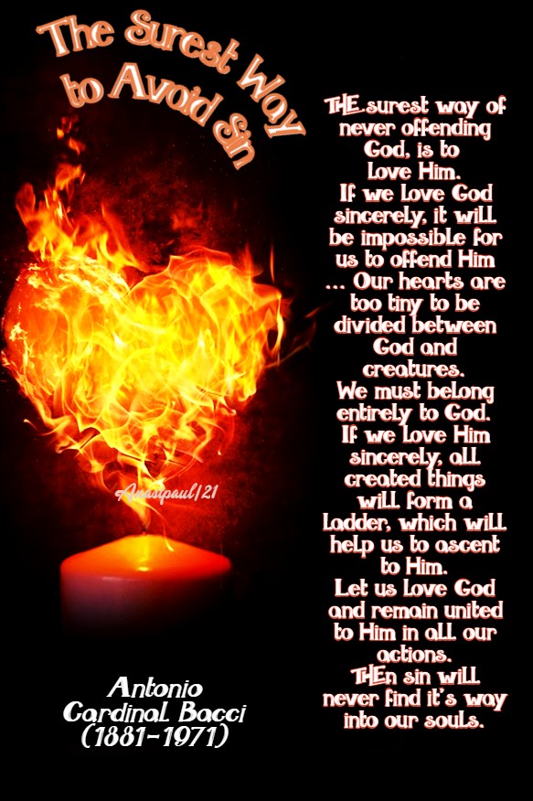 “The surest way of never offending God, is to love Him. If we love God sincerely, it will be impossible for us to offend Him. “Love,” says St Paul, “is the fulfilment of the Law,” (Rom 13:10) and charity “is the bond of perfection” (Col 3:14). If all our actions are inspired by the love of God, it will not matter how insignificant they are, for they will be pleasing to Him and will gain merit for ourselves. Then it will be impossible for us to sin.