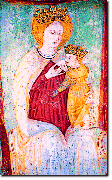 Where the Sanctuary of Morbio now stands, a castle stood centuries ago, attested in 1198 and destroyed in the first half of the sixteenth century. Only the ruins of a Chapel, dedicated to St Bernardino of Siena, transformed over time into a pile of rubble, buried by weeds, brambles and thorns., remained. Surrounded by ivy and fortunately well preserved, remained the Fresco in the Chapel, depicting the Virgin with the Child. The history of the Sanctuary of Holy Mary of Miracles began on 29 July 1594. It was a Friday when the two mothers with their daughters, Catherine and Angela , respectively ten and seven years old, travelled to Morbio to entreat the assistance of Fr Gaspare Basbetrini. They were sick girls, tormented by the devil and had travelledp to Morbio, to ask for the blessing of Don Gaspare Barberini, the assistant Priest at Morbio, who was well-known as an Exorcist. However, sadly for the pilgrims, Fr Basbetrini was absent. To the tiredness of the journey and the sadness of illness, the bitterness of disappointment was added. Among the ruins of the ancient castle the little group of supplicants waited and discovered on the crumbling and crumbling walls, the faded remains of a fresco depicting the Virgin in a deeply maternal position nursing Baby Jesus. The two mothers knelt before the Virgin with their daughters and prayed in deep sadness and devotion for the intercession of the Holy Mother to come to the aid of the sick children. And then the miracle happened. Those two poor simple and innocent creatures were cured. This is Morbio’s miracle – the Madonna appeared to the two little girls and cureds them of all their illnesses, dispelling any demonic presence within them. Our Lady spoke to the elder girl, Catherine and instructed her to tell the Bishop that the Church should be rebuilt and that the Holy Rosary must be said everyday. Eight days after the event, on 5 August 1594, the episcopal curia of Como, whose ecclesiastical jurisdiction also extended to the southern regions of Ticino, instructed the regular canonical process, which recognized , upon the sworn deposition of the main eyewitnesses, the truth of what happened and their prodigious and supernatural nature. A stained-glass window, located at the top of the apse and placed at the beginning of this century, illustrates and reminds those who enter the Sanctuary of this miracle. Catherine is depicted on a ladder, with her arms outstretched, listening in front of the image of the Madonna dei Miracoli. At the foot of the ladder, Angela, the other sick girl, is lying asleep.