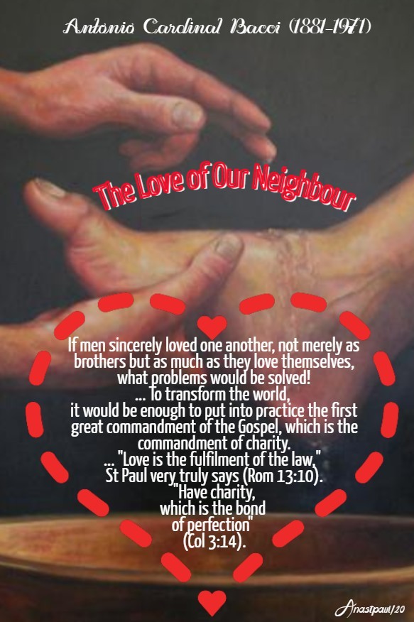 “The Gospel not only commands us to love God above all things but also, to love our neighbour as ourselves (Cf Mt 13:35-40). The Christian love of our neighbour, flows necessarily from the love of God. Our Creator loves all men as His own sons. Therefore, we ought to love one another as brothers, even as Our Lord loves us. We should see, in our neighbour, especially if he is in need, the person of Christ Himself, our elder brother, “the first-born among many brethren” (Rom 8:29).