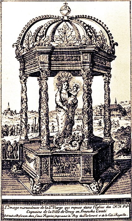 It is reported, that Jeanne Bonnet was rewarded by signal graces she obtained through Our Lady’s intercession. She intended to give the Statue to a local Church but, in 1616, yielded to the repeated entreaties of Father Gabriel Appremont, who wanted to have the image for the Capuchins of Gray. A special Chapel was richly decorated to receive it. The news soon spread in the region of Gray and the faithful flocked to pay their respects to the new Madonna, Our Lady of Gray.