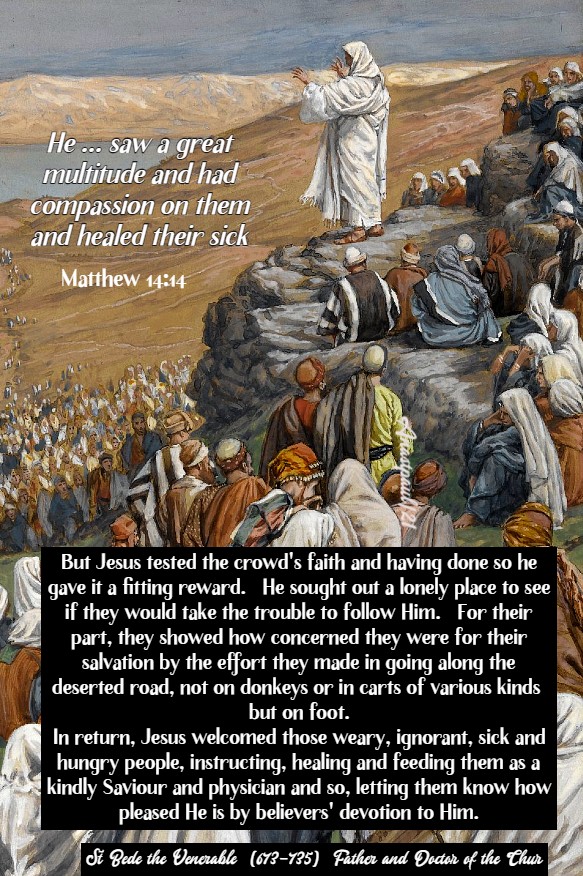 But Jesus tested the crowd’s faith and having done so he gave it a fitting reward. He sought out a lonely place to see if they would take the trouble to follow Him. For their part, they showed how concerned they were for their salvation by the effort they made in going along the deserted road, not on donkeys or in carts of various kinds but on foot.