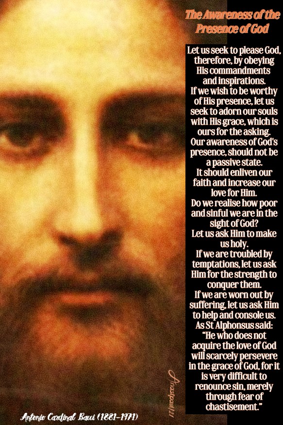 Let us seek to please God, therefore, by obeying His commandments and inspirations. If we wish to be worthy of His presence, let us seek to adorn our souls with His grace, which is ours for the asking. Our awareness of God’s presence, should not be a passive state. It should enliven our faith and increase our love for Him.