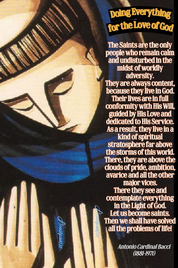 “The beginning of perfection consists in doing the Will of God, even in our smallest actions. But, to do everything for the love of God, is the summit of Christian perfection. If we aimed always at doing God’s Will and acting from the motive of love for Him, we should be contented and at peace because we should be holy. The Saints are the only people who remain calm and undisturbed in the midst of worldly adversity. They are always content, because they live in God. Their lives are in full conformity with His Will, guided by His Love and dedicated to His Service. As a result, they live in a kind of spiritual stratosphere far above the storms of this world. There, they are above the clouds of pride, ambition, avarice and all the other major vices. There they see and contemplate everything in the Light of God. Let us become saints. Then we shall have solved all the problems of life!.” Amen