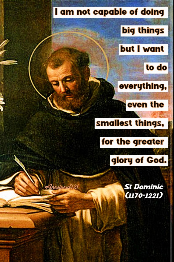 St Dominic de Guzman OP (1170-1221) (Memorial) Founder of the Dominican Order of Preachers – Priest, Founder, Confessor, Teacher, Preacher, Mystic, Miracle-Worker, Apostle of the Holy Rosary. At Dominic’s baptism, Blessed Joan, his Mother, saw a star shining from his chest, which became another of his symbols in art, and led to his patronage of astronomy. The Roman Martyrology states today: “At Bologna, St Dominic, Confessor, Founder of the Order of Friars Preachers, most renowned for sanctity and learning. He preserved his chastity unsullied to the end of his life and by his great merits, raised three persons from the dead. After having repressed heresies by his preaching and instructed many in the religious and Godly life, he rested in peace on the 6th of this month. His Feast, however, is celebrated on thsi day by decree of Pope Paul IV.” https://anastpaul.wordpress.com/2017/08/08/saint-of-the-day-8-august-st-dominic-de-guzman-founder-of-the-dominican-order-of-preachers/
